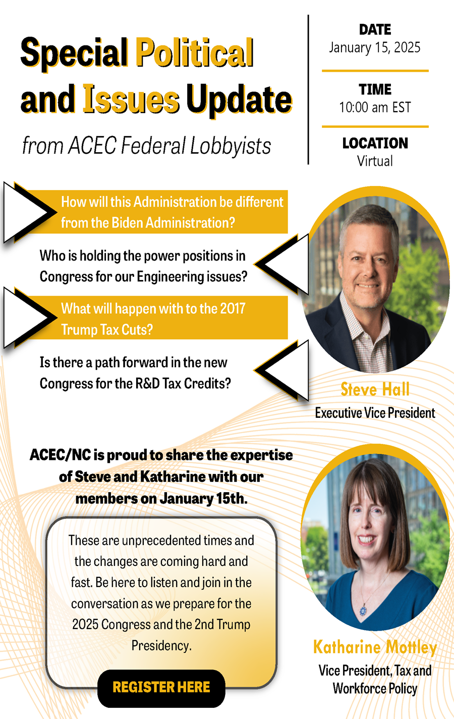 Session Description: Join Steve Hall, ACEC Executive Vice President, Advocacy, and Katharine Mottley, ACEC Vice President, Tax and Workforce Policy, for an overview and update on national tax issues affecting our industry.