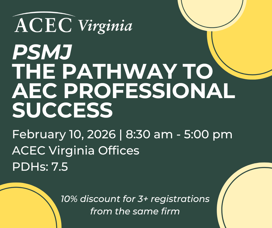As an ACEC Virginia member you will receive a $50 discount if you register for a virtual session by using the registration code, ACECVA50.