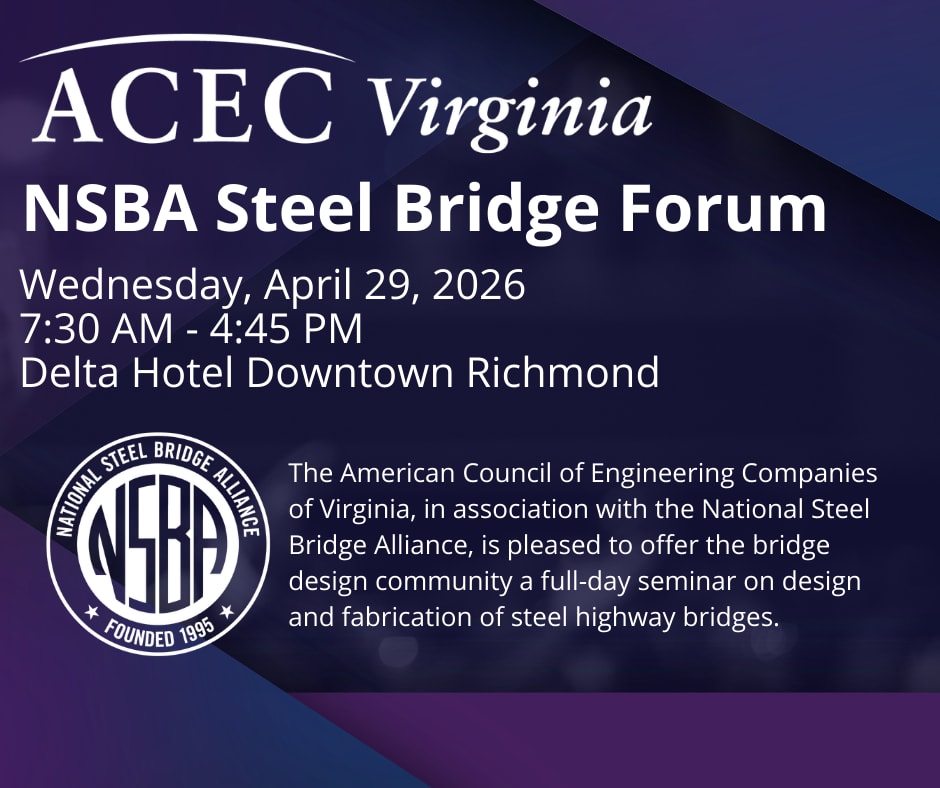 The National Steel Bridge Alliance, in association with Virginia Department of Transportation and ACEC Virginia, is pleased to offer a full-day seminar on design and fabrication of steel highway bridges. This event is a great way to immediately increase your understanding and knowledge of steel highway bridges and network with industry colleagues.