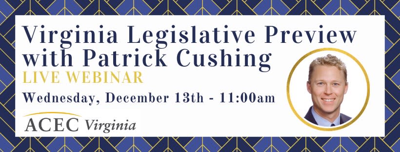 Join us for a 2023 recap and 2024 Session Preview with Patrick Cushing of Fall Line Strategies. Patrick will also summarize the Commonwealth’s current fiscal condition and a preview of issues he expects to see during the upcoming Session, along with post-election notes. Topics will include legislative initiatives that will impact the business community and a focus on those issues that may uniquely impact engineering firms in the Commonwealth.