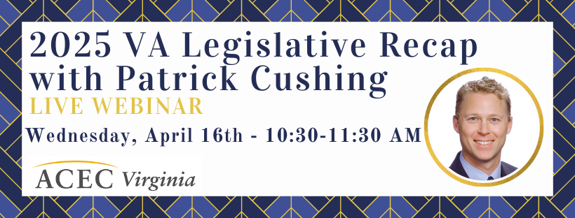 Join ACEC Virginia lobbyist Patrick Cushing of Fall Line Strategies for a highlight reel of the 2025 General Assembly Session. Patrick will cover legislative issues that touch our industry.