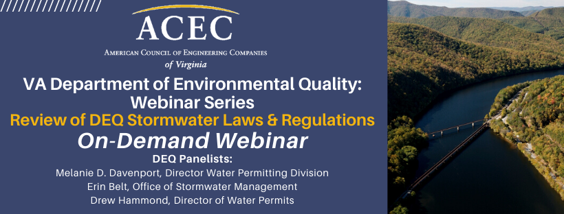 ACEC Virginia and DEQ has partnered to bring our members a webinar series to facilitate discussion on topics surrounding the environment in Virginia.
